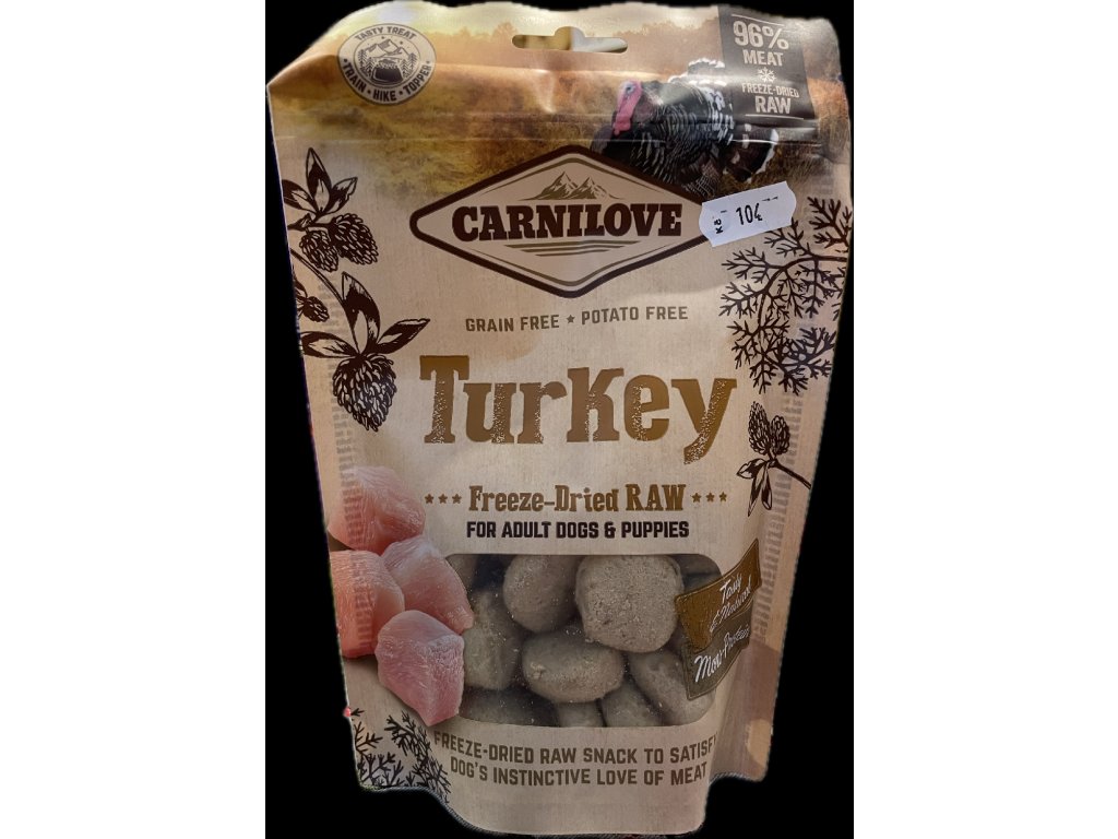 Carnilove Dog Freeze-Dried Raw Snacks Turkey 60 g jsou mrazem sušené pamlsky z čerstvé krůty, ideální pro všechny psy, kteří si zaslouží čistou chuť masa bez kompromisů . Díky moderní metodě lyofilizace (freeze-drying) si pamlsky uchovávají maximum přirozených živin, chutí a vůní, jako byste právě ukrojili kousek čerstvého masa – jen bez vlhkosti a nutnosti chlazení .